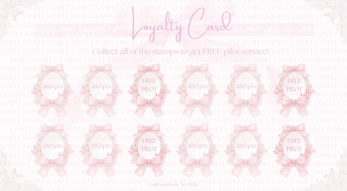 Earn rewards while availing my pilot service! Every $8.20/₱480 spent = 480 points (1 stamp). Collect 2 stamps (960 points total) and you’ll receive an exclusive FREE 16-day pilot service as a thank you for your loyalty.